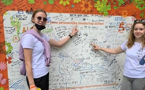 In juni 2021 lopen dochter Kyra, vriendin Betty, Esmeralda en Ineke mee met de ALS Lenteloop in De Bilt.